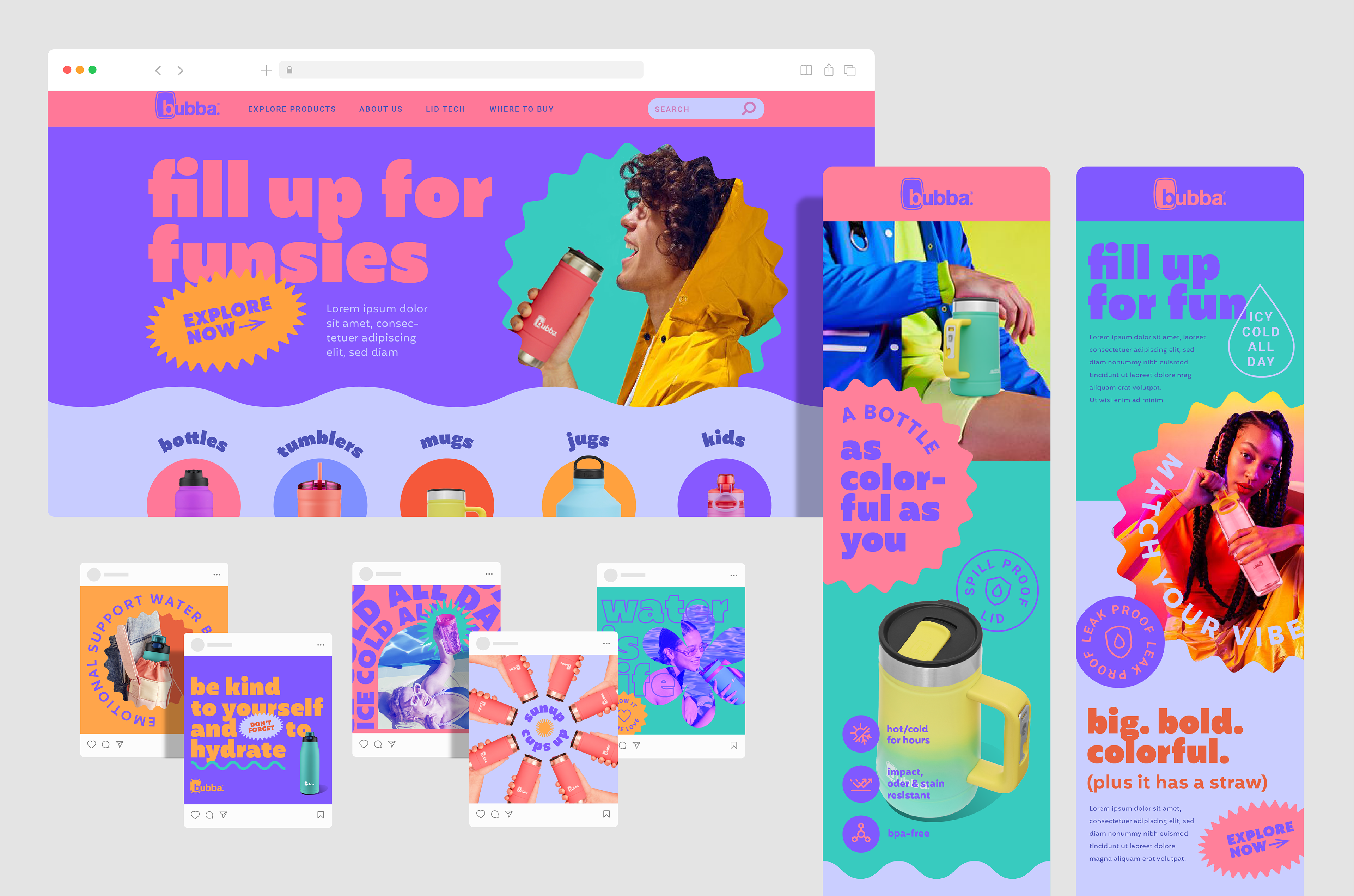 As part of the Bubba brand refresh, I contributed a bold visual concept aimed at energizing the brand and connecting with a younger, style-conscious audience. While I was a supporting designer on the broader initiative, my concept stood out for its vibrant personality — featuring bold color blocking, stylized photography, and dynamic typography and graphic treatments. Though it ultimately didn’t go to market, the direction helped influence the overall evolution of the brand. The work reflected Bubba’s shift toward more fashion-forward product design and playful self-expression.